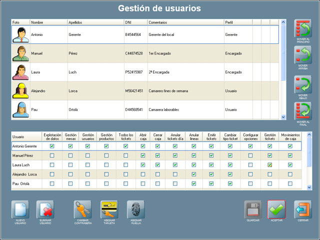 Podrás gestionar usuarios por perfiles dando a cada uno los permisos que consideres necesarios y convenientes, proteger cuentas y accesos con contraseñas, tarjeta o huella digital. También podrás controlar las acciones que se realizan por parte del personal (anulación de tickets, apertura de cajón, etc.) controlar las invitaciones que se realizan y los horarios del personal.