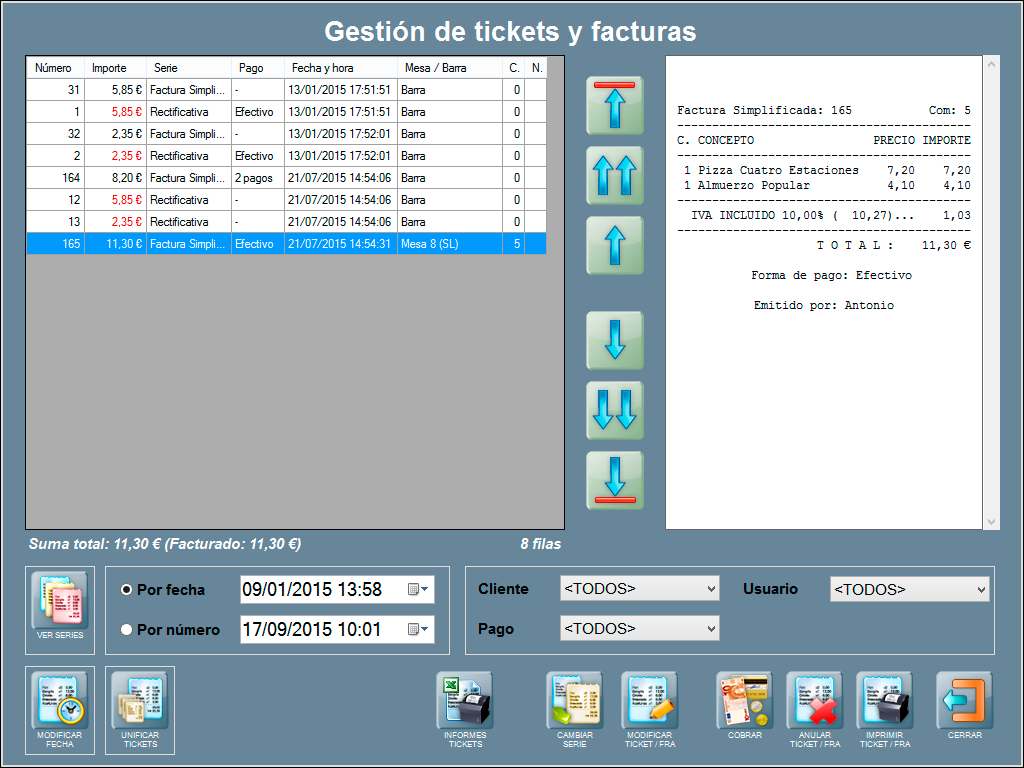 Gestiona eficientemente la actividad en barra. Los pedidos se registran digitalmente disminuyendo de forma drástica los registros erróneos de pedidos. Te permite cuentas de barra rápida, imprimir, abrir el cajón y cobrar con un solo botón, gestionar pagos tanto totales como parciales, dividir el ticket entre varios comensales, gestionar pagos en efectivo, viso o cheque restaurante o disponer de múltiples tarifas (terraza, barra, mesa, sala vip, etc.)